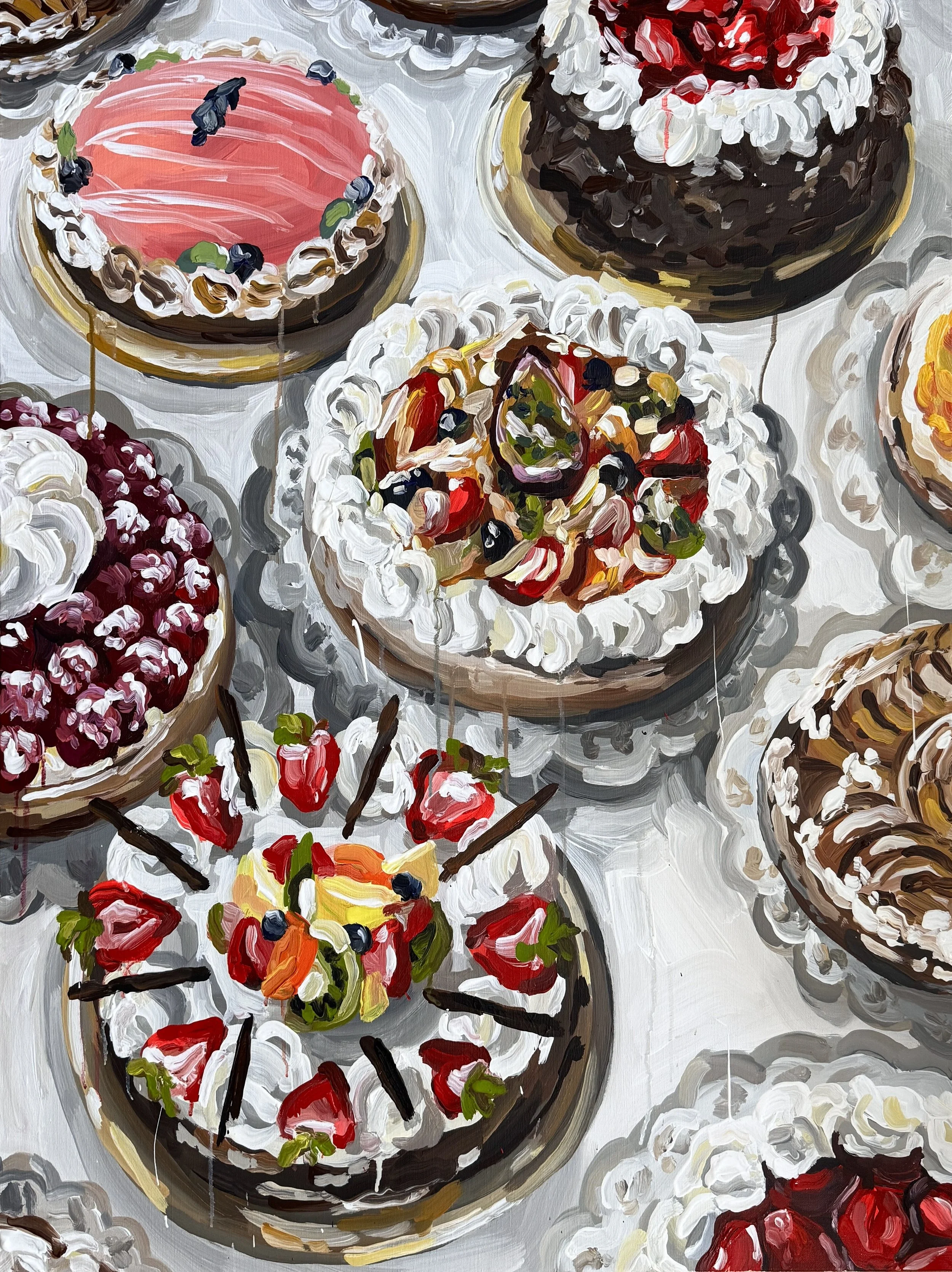 Ik heb geen favoriet werk, maar mijn favoriete reeks om te schilderen is de "Patisserie"-reeks. Patisserie inspireert me door de rijke kleuren, verschillende texturen en speelse vormen. Het herinnert me aan het plezier van ontdekken en genieten, iets wat ik graag vastleg in mijn schilderijen.