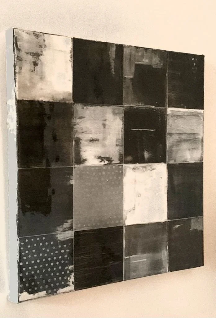 “Ik ben sedert vorig jaar begonnen aan een reeks schilderijen die ik overgiet met epoxy. De epoxycoating geeft een mooie glanzende afwerking die de kleuren versterkt en een bijzondere gelaagdheid en diepte geven.