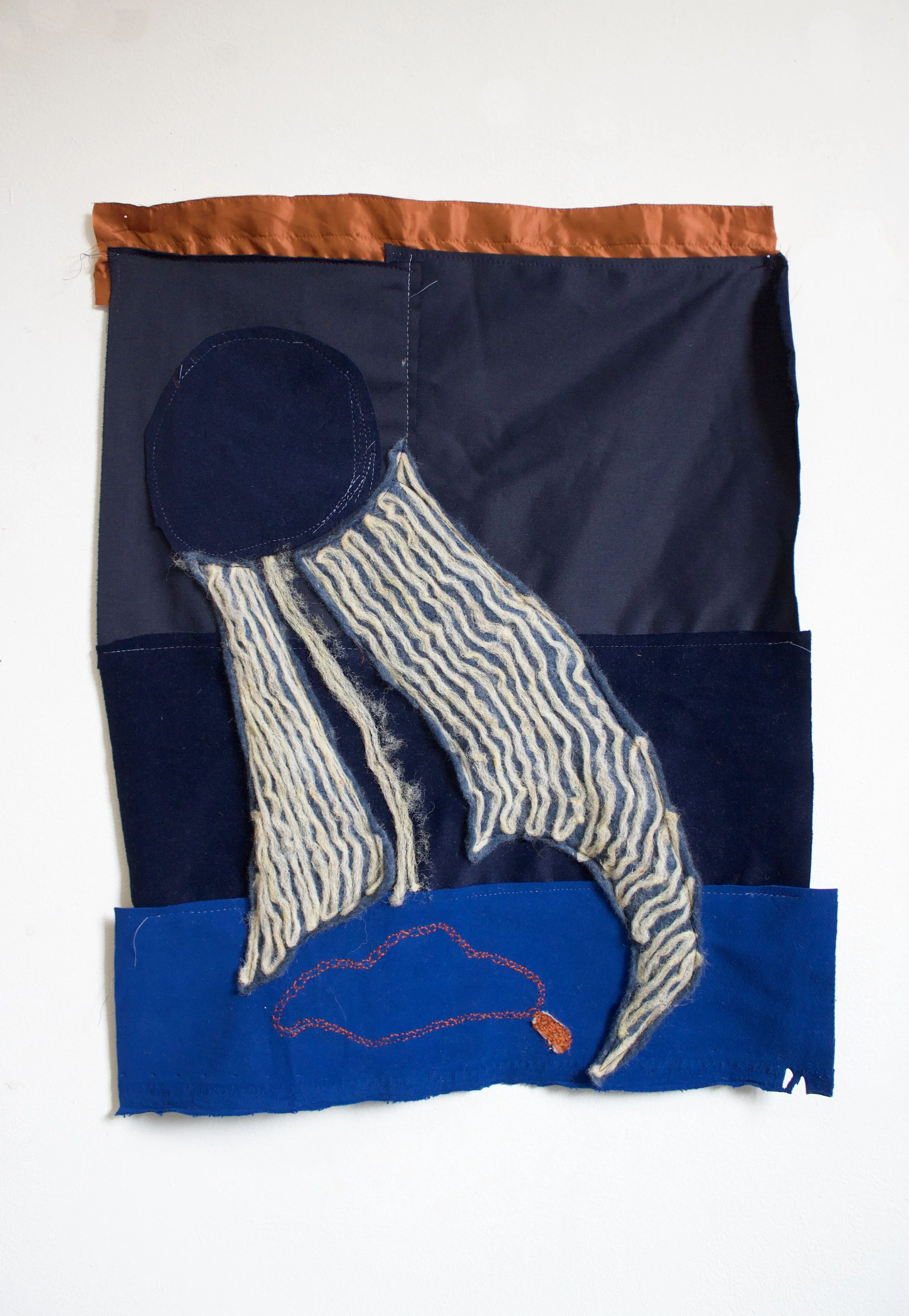 “In mijn werk ga ik altijd op zoek naar een bepaalde geborgenheid en veiligheid waar ik mijn puurste zelf kan zijn. Hierbij zoek ik vaak naar materialen die deze gemoedstoestand prikkelen. Vilten (het repititieve, zachte en langdurige proces) in combinatie met stoffen die hergebruikt worden van mijn mama, verf, handborduren, oliepastel .. enzovoort zorgen voor extra toevoeging aan deze basis.