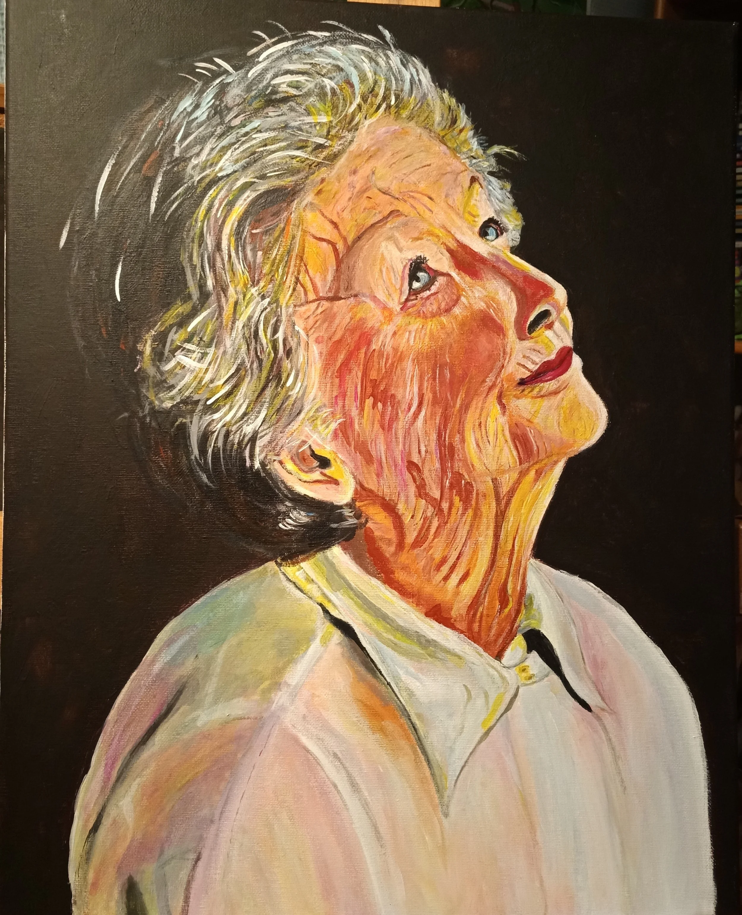 ‘De oude vrouw die naar boven kijkt’ blijft mijn favoriete werk. Als jonge moeder werd ik geconfronteerd met het onverwacht overlijden van mijn dochter. Dit onnoemelijke verlies draag ik elke dag met mij mee en ik weet dat mijn allerlaatste gedachte, die aan mijn dochter zal zijn. De tijd werkt louterend en leert mij om verdriet en onmacht om te buigen naar geluk en aanvaarding. Ook deze vrouw weet dat de eeuwigheid ooit wenkt. Ze kijkt naar omhoog alsof ze iemand verwacht… weldra.