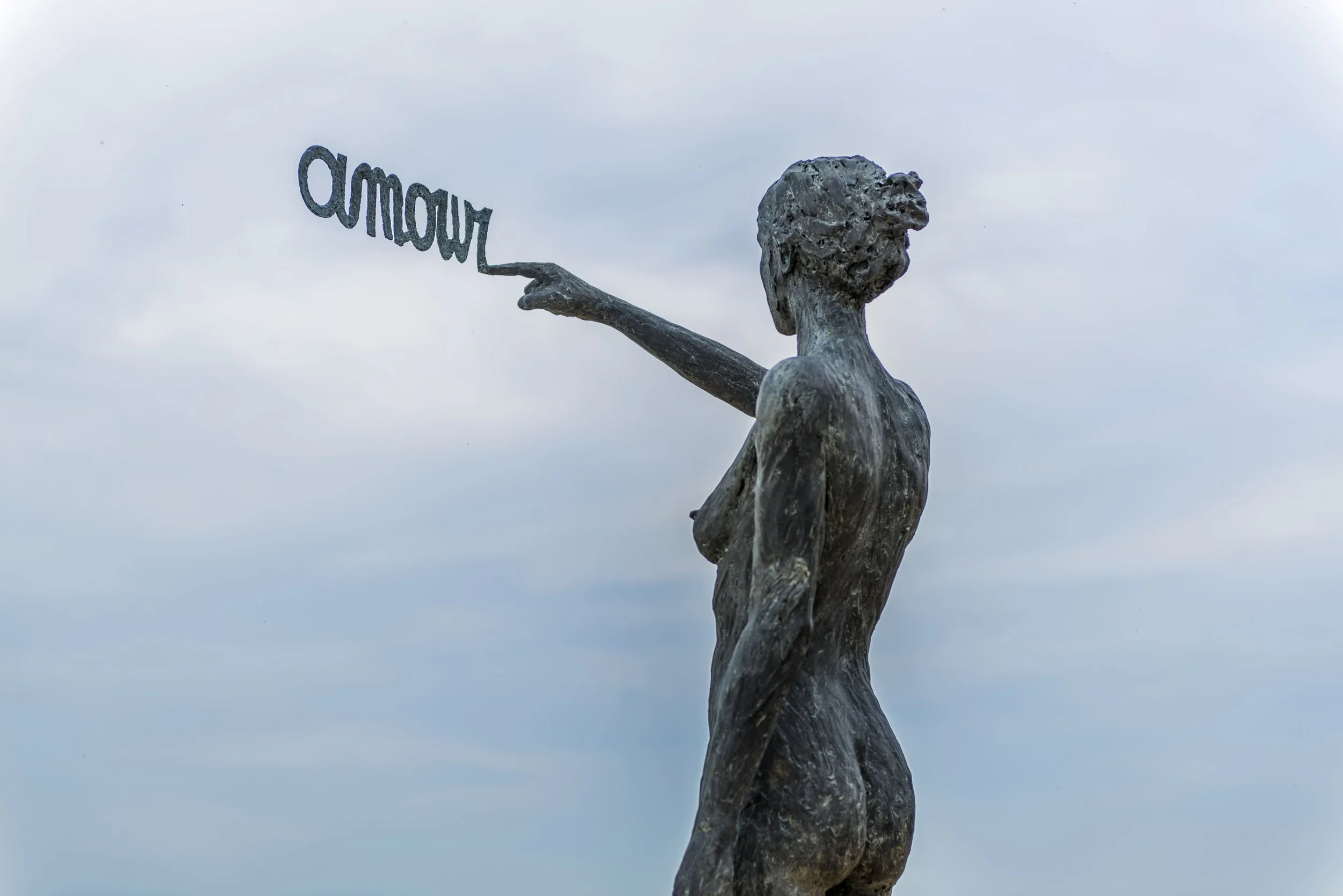 ‘De l'amour.’ Het beeld staat nu definitief op de zeedijk van De Haan. Ik kreeg onlangs een anonieme dankbrief van twee mensen die elkaar ontmoet hadden bij mijn beeld, een gesprek over liefde begonnen en sindsdien een koppel zijn. Ik heb dit beeld gemaakt na de aanslagen in Brussel. Een journalist had zijn dochter verloren en getuigde die avond op tv in het Frans dat hij maar één antwoord had : 'de l'amour'. Helaas is dit beeld vandaag de dag nog altijd actueel. Liefde is het antwoord.