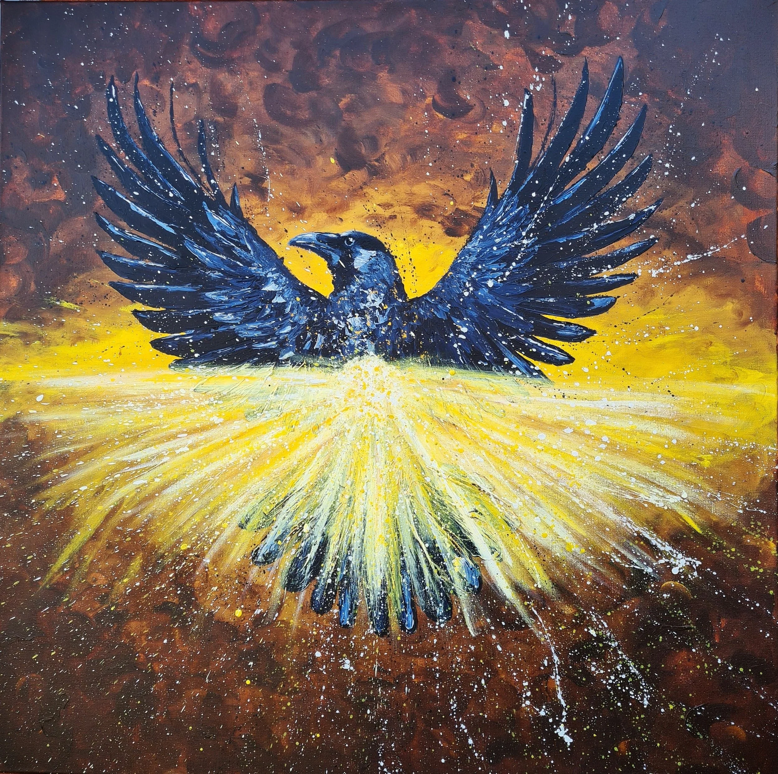 De raaf staat symbool voor kracht, bewustzijn en transformatie. In Energyburst voelt hij tot in zijn vezels wat hem uitput en wat hem voedt, en hij maakt de keuze om zijn energie te richten op wat hem écht dient. Die boodschap was – en is – voor mij persoonlijk ontzettend belangrijk.